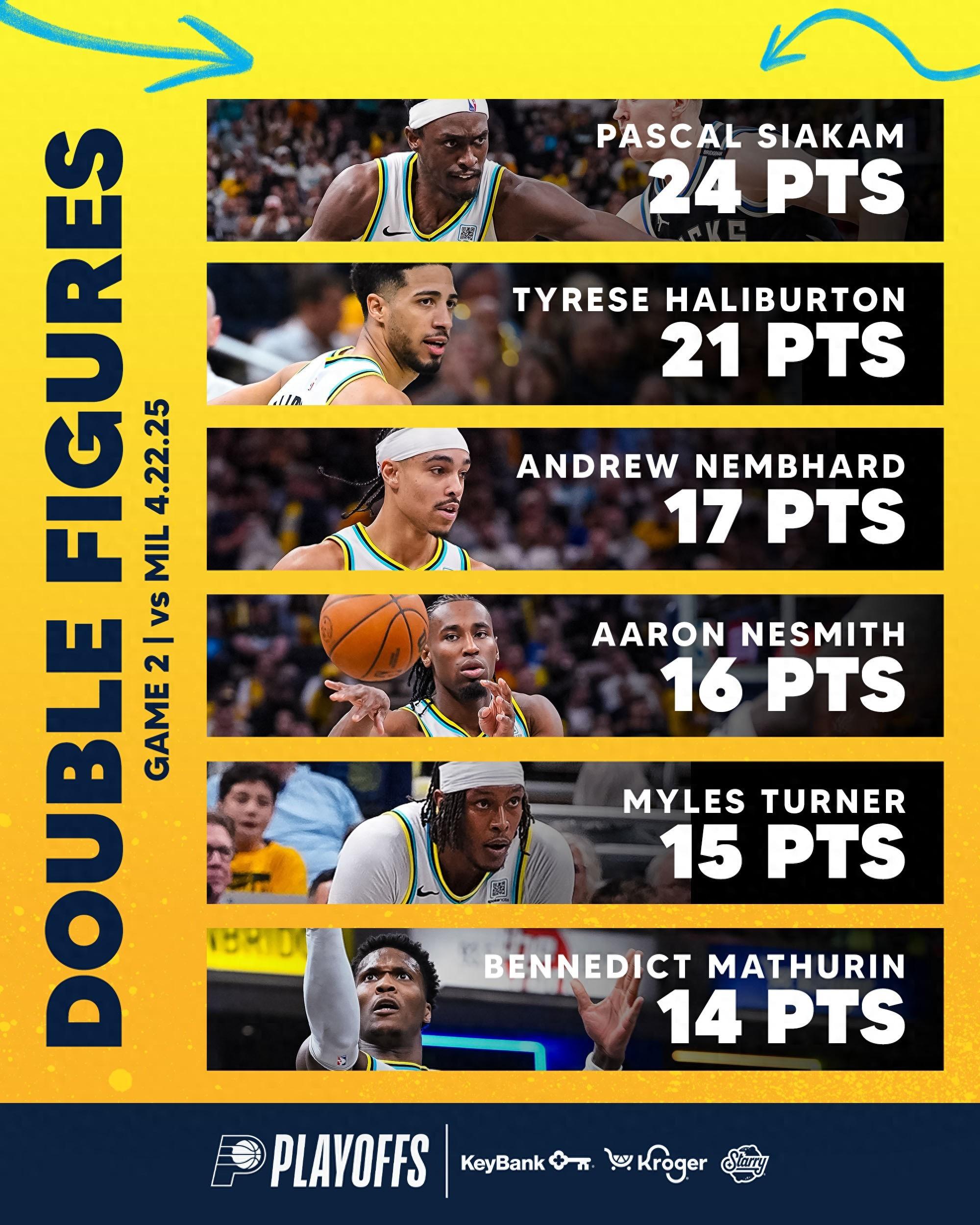 本場比賽,步行者全民皆兵,共有6人得分上雙:西亞卡姆24分、哈利伯頓21分、內姆布哈德17分、內史密斯16分、特納15分、馬圖林14分。