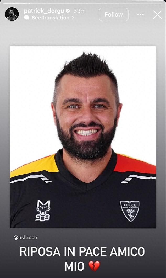 萊切隊理療師格拉齊亞諾-菲奧裏塔於今日不幸去世,年僅38歲。曼聯邊後衛帕特里克-多古在社交媒體上發佈了一張菲奧裏塔的照片,並附上意大利語留言:“Riposa in pace amico mio”(安息吧,我的朋友)。