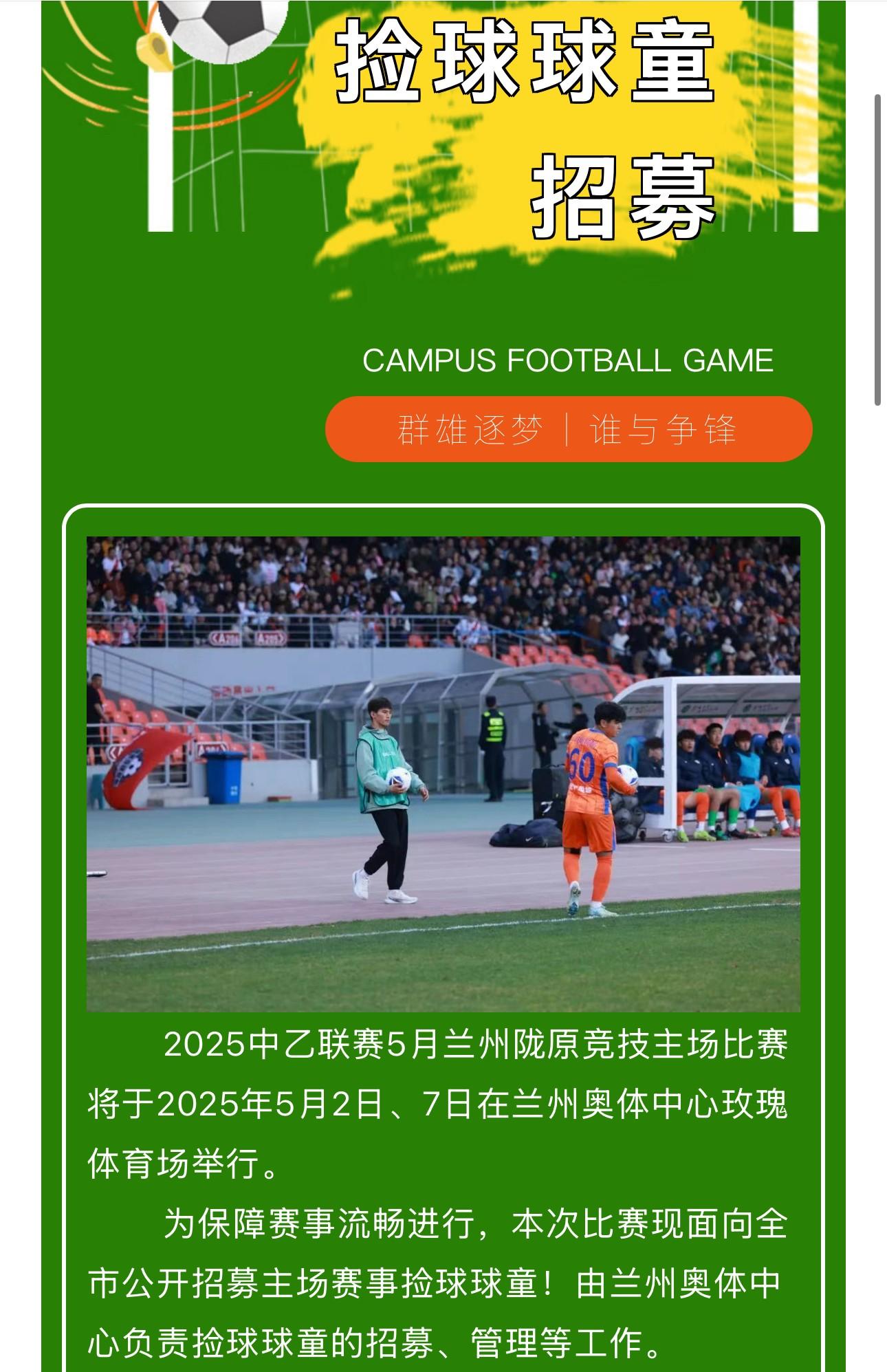 另外,蘭州奧體中心官方公衆號也發佈了招募信息——2025中乙聯賽5月蘭州隴原競技主場比賽將於2025年5月2日、7日在蘭州奧體中心玫瑰體育場舉行。爲保障賽事流暢進行,本次比賽現面向全市公開招募主場賽事撿球球童!由蘭州奧體中心負責撿球球童的招募、管理等工作。