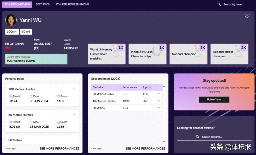 5月3日晚,在2025長三角國際田徑鑽石賽(上海/紹興柯橋)女子100米欄項目中,吳豔妮以12秒96的成績獲得第8名,刷新個人賽季最好成績。
