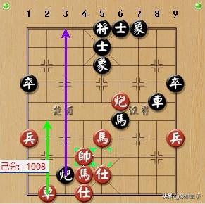 黑方受此一擊,千分優勢瞬間全完,是時,黑仍應車8進3,貫徹點車殺棋的思路,還能對峙。