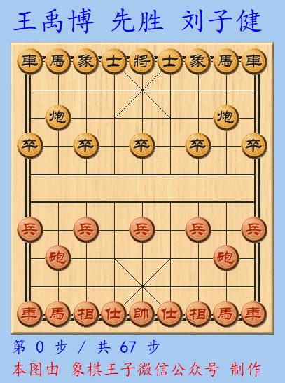 加賽超快棋第一局,雙方棋入中局,對峙間,王禹博執先隨手平邊炮,黑方此時炮6平7,平炮打車,下手馬7進8奔馬撲槽,就成殺局,劉子健未察覺,紅方趕忙回來兌炮,再躲一劫,成和。