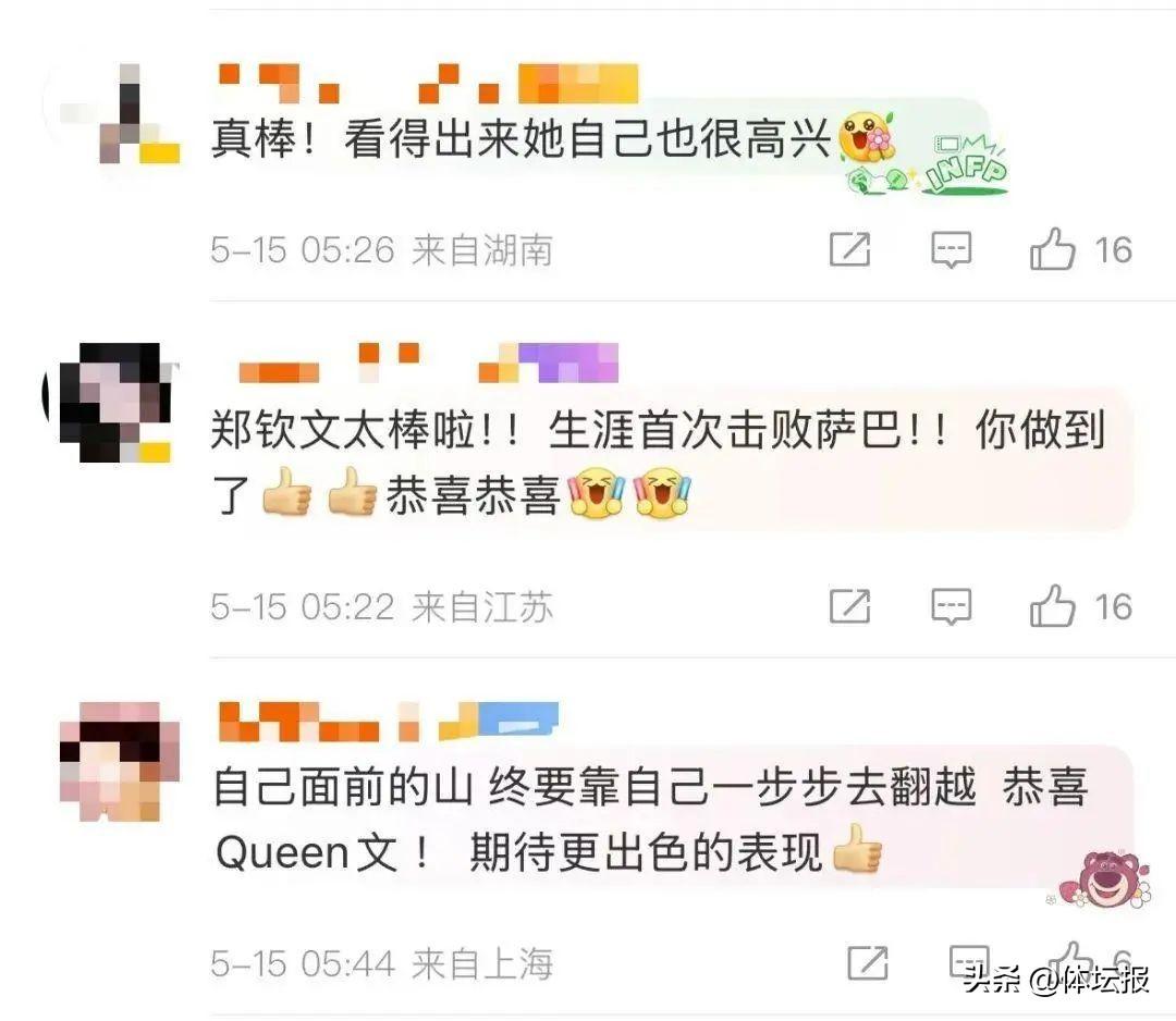 這也是鄭欽文職業生涯首次戰勝薩巴倫卡