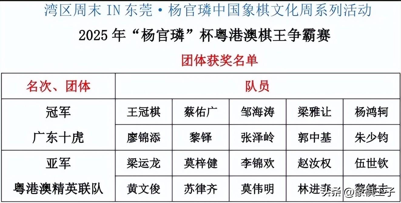 熱烈祝賀2025年粵港澳棋王爭霸賽在全國象棋之鄉鳳崗圓滿成功,恭賀天下第一軍團,綠林第一品牌廣東十虎豪取個人和團體雙料總冠軍,稱霸棋界宗師,魔叔楊官璘的家鄉,十虎天團威武霸氣帥,爲大賽和十虎點贊,鼓掌,賀喜!