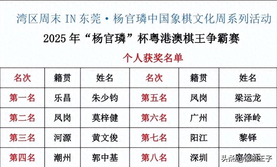 紀念楊老百年誕辰(1925-2025),粵港澳賽的盛會,在全國象棋之鄉,魔叔楊官璘的家鄉鳳崗強勢戰罷,火熱收兵,個人、團體桂冠全線產生,榮耀出爐。
