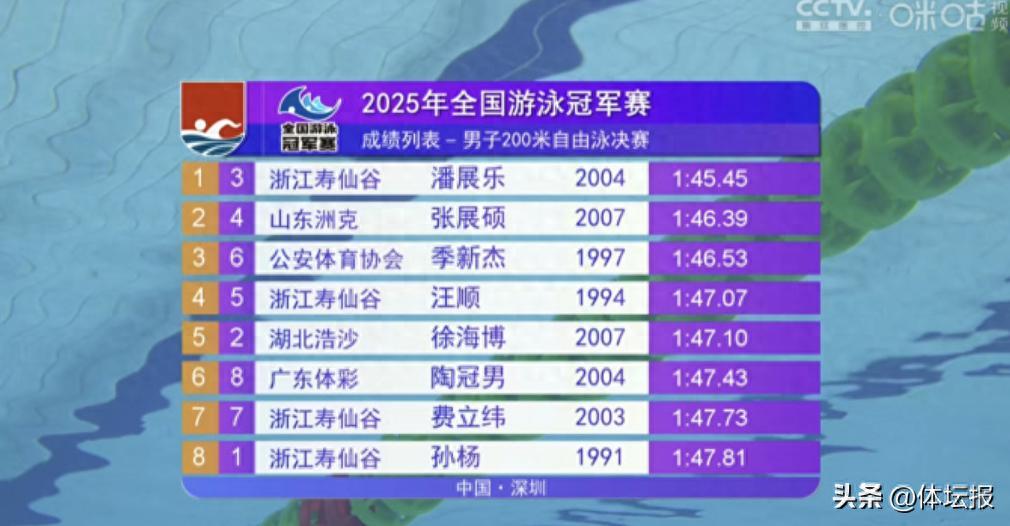 ■ 最終,潘展樂游出1:45.45獲得冠軍,收穫本次游泳冠軍賽第三枚金牌。山東洲克的張展碩、公安體育協會的季新傑分獲二、三名。汪順位列第四,費立緯、孫楊排在第七、第八。