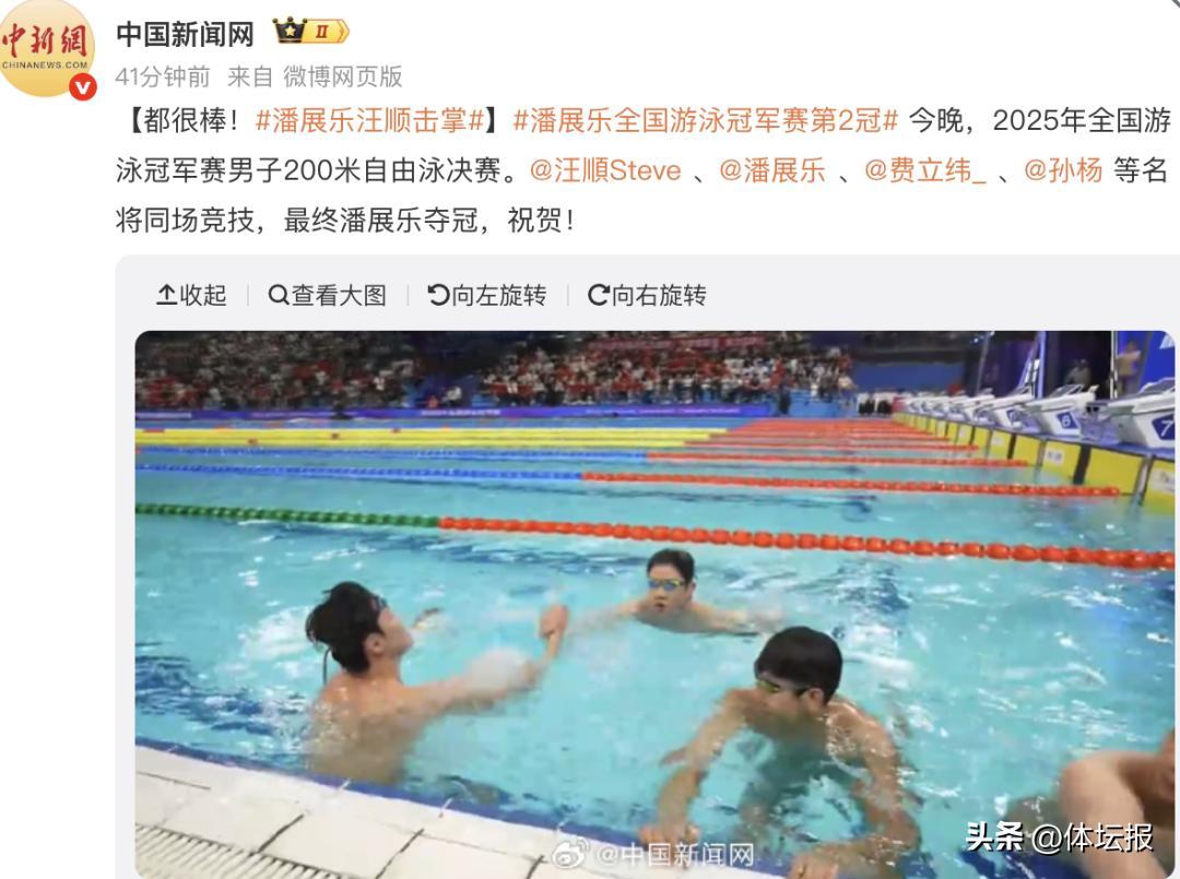 賽後,汪順與潘展樂擊掌祝賀,他說:“競技體育相互競爭、相互促進,是一個非常好的過程,大家都是一起努力在這個項目中創造一個個非常好的成績。”