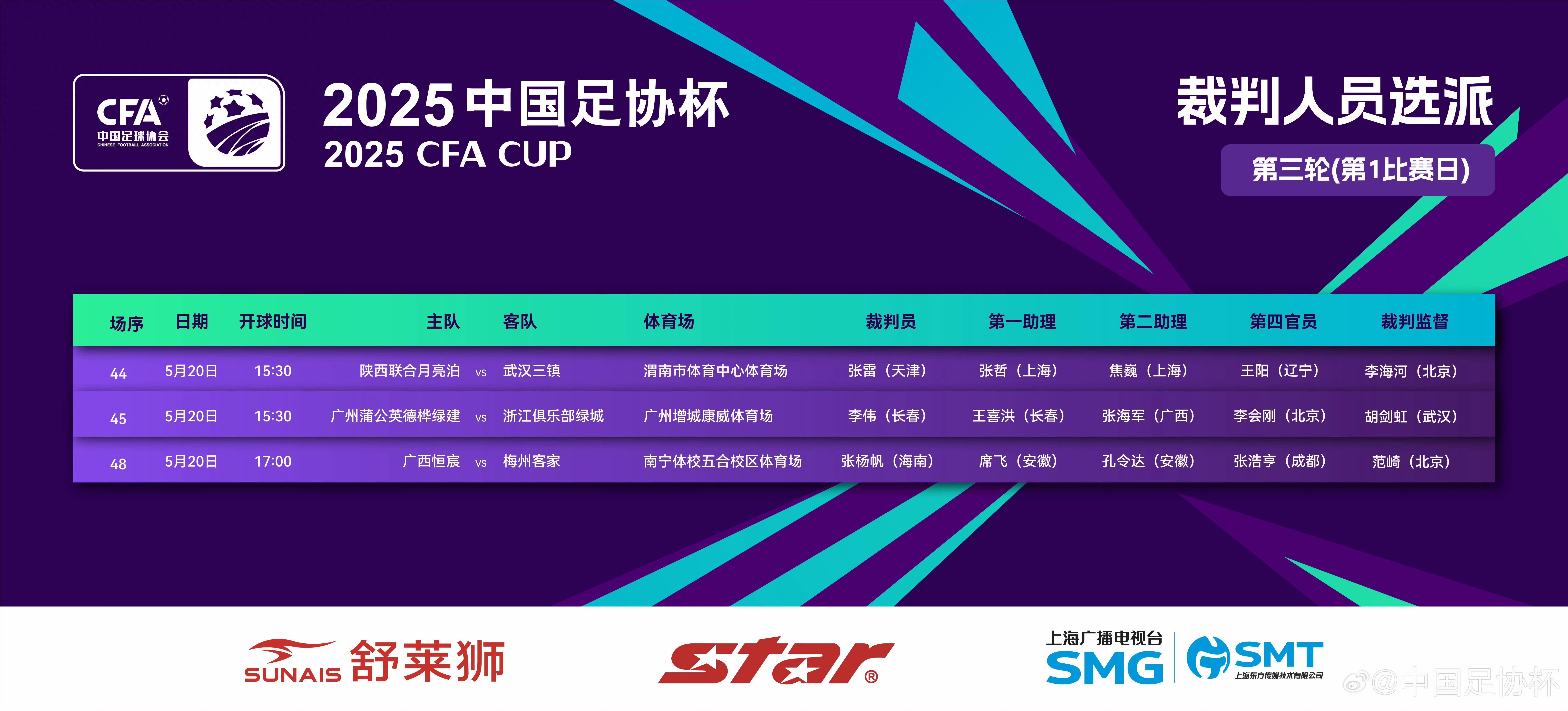 北京時間5月20日,足協盃第三輪第1比賽日的裁判名單公佈,張雷執法陝西聯合vs武漢三鎮。