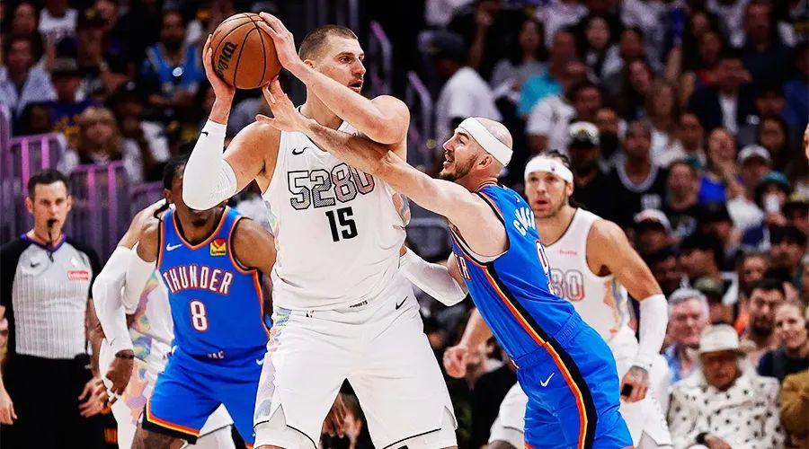 這份能力也是雷霆敢讓他對位約基奇的原因。約老師雖然強無敵,可他畢竟是個身高2米11的大中鋒,永遠不能把運球重心壓得像穆雷那樣低。於是卡魯索就能用飛龍探雲手持續施壓,像一塊口香糖黏在約基奇腳底板,不斷增加他的持球難度,給這顆接近過載的CPU持續輸入干擾信息。最終,在雷霆全隊的配合下,成功拉爆了掘金的最強大腦。