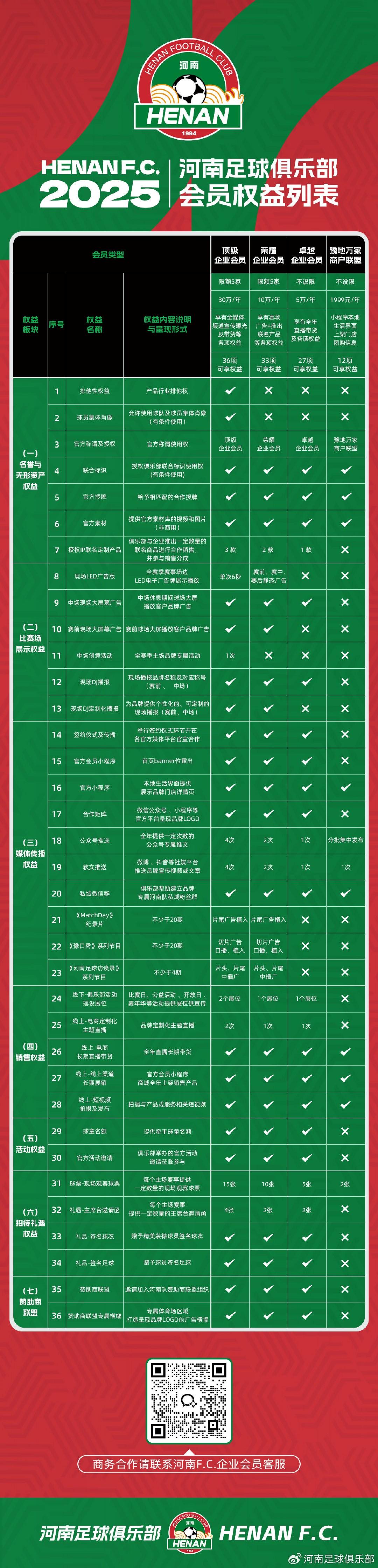 現河南足球俱樂部面向全社會發布2025年度企業會員合作體系。誠邀您的加入,配套權益及服務方案視具體敲定時間開放洽談。希望與您在未來攜手共進,合作共贏,一起推動河南足球事業邁向新高度,爲中國足球發展注入力量!