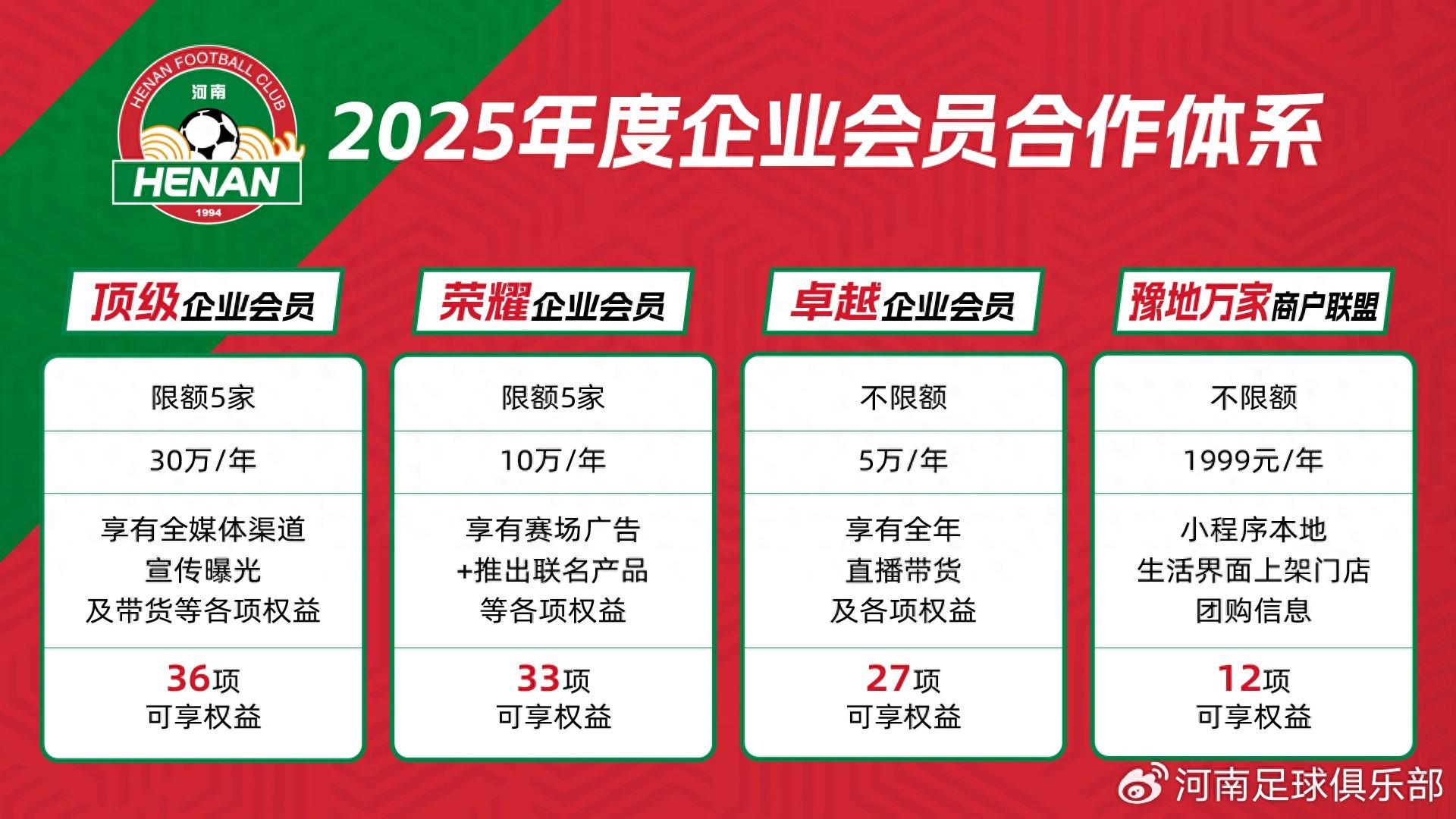 5月24日,河南足球俱樂部2025年度企業會員合作體系正式發佈,有4個檔次的會員可以參與。