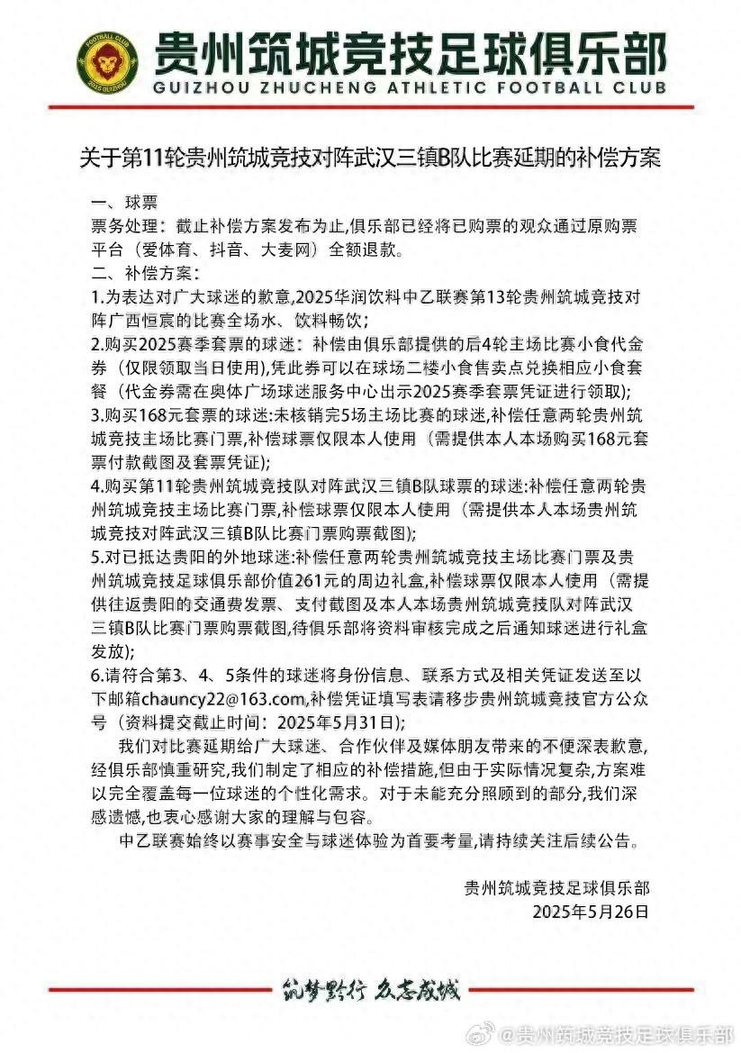 北京時間5月26日,中乙貴州築城競技隊官方發佈了比賽延期補償方案的公告,其中購票球迷可以全額退款,此外下一個主場飲料暢飲等多項措施。