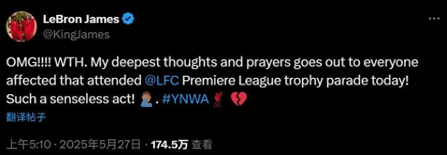 在利物浦奪冠遊行期間出現了車輛衝撞慶祝人羣的事件之後,利物浦的小老闆NBA球星勒布朗-詹姆斯也在社媒發文,聲援利物浦和利物浦球迷。