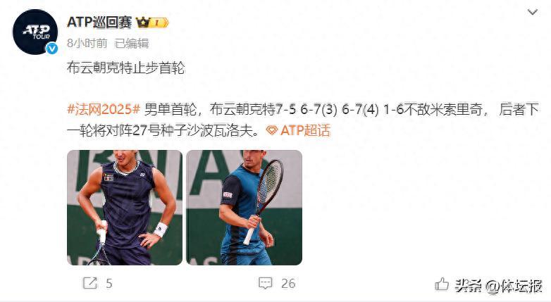 北京時間5月27日凌晨,法國網球公開賽男子單打首輪,首次參加正賽的浙江選手布雲朝克特經歷3小時34分鐘的苦戰,在先勝一盤的情況下7-5、6-7(3)、6-7(4)、1-6不敵從資格賽突圍的奧地利選手米索裏奇,繼2024年美網和2025年澳網之後,第三次大滿貫正賽之旅仍無緣首勝,即時排名來到68(+2)。