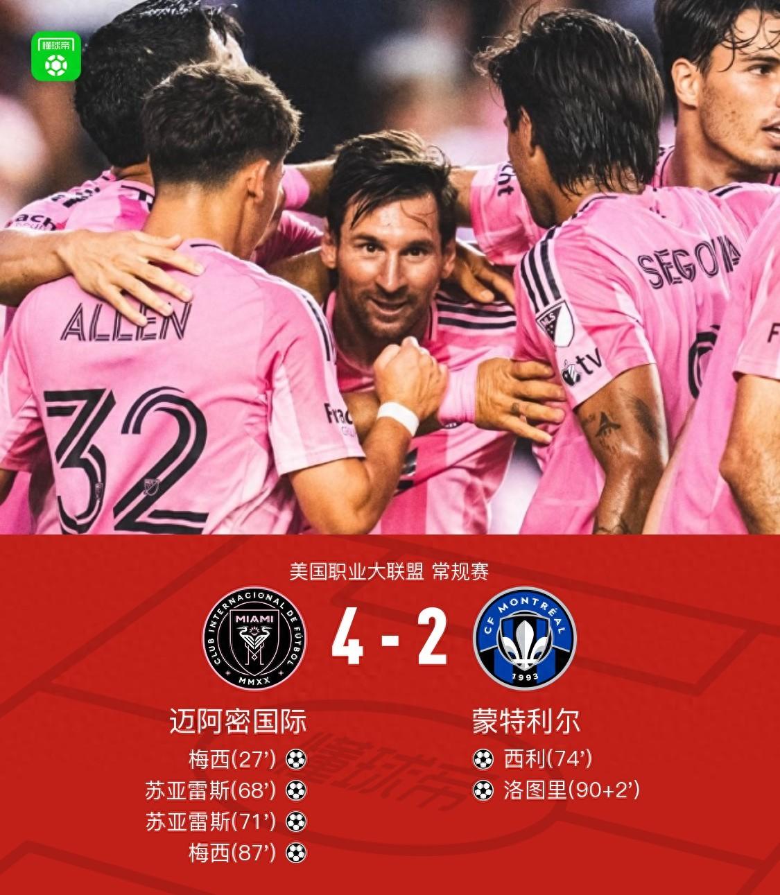 邁阿密國際4-2蒙特利爾,梅西、蘇牙相互傳射,雙雙梅開二度