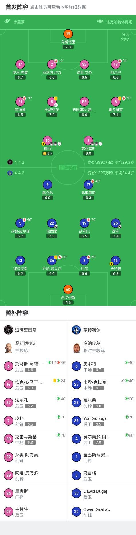 北京時間5月29日,美國職業大聯盟常規賽,邁阿密國際主場迎戰蒙特利爾。比賽中,梅西表現出色,不僅首開紀錄還完成梅開二度,併爲蘇亞雷斯送上一次助攻。蘇亞雷斯同樣狀態火熱,他不僅打入兩球,還爲球隊進攻端提供了重要支持。蒙特利爾方面,西利抓住機會攻入一球,洛圖裏在比賽尾聲階段錦上添花。最終,邁阿密國際以4-2戰勝蒙特利爾。