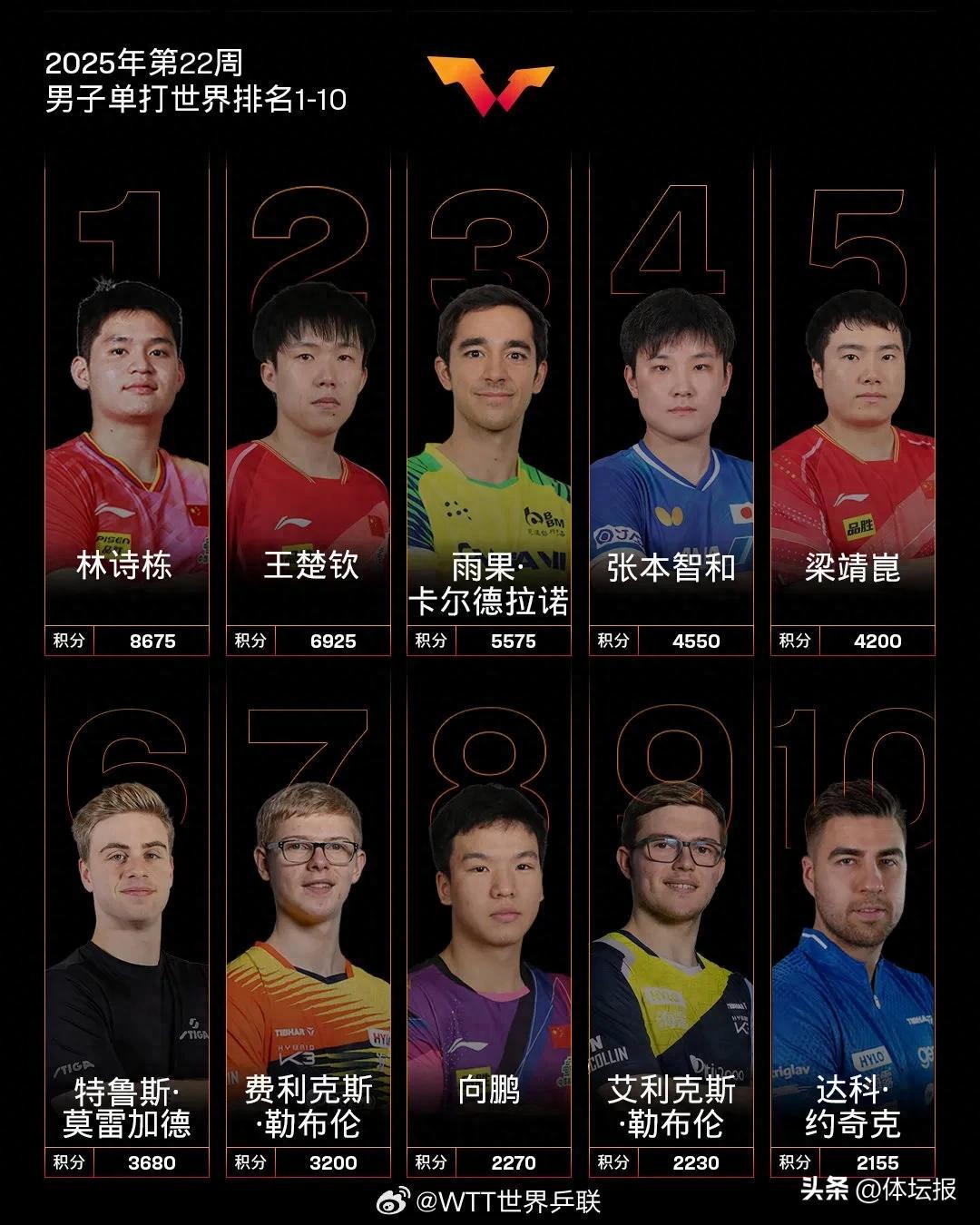 北京時間5月27日,國際乒聯公佈2025年第22周世界排名。男子單打中,向鵬排名上升1個名次超越法國選手勒布倫,位列世界第八。