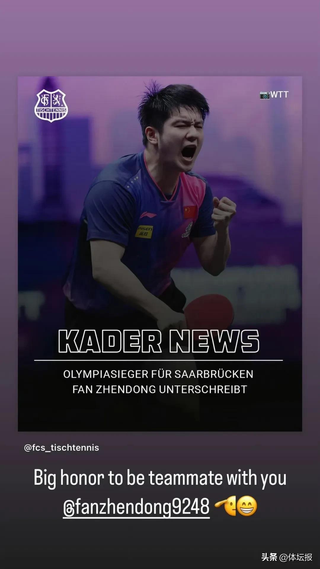 在俱樂部官方聲明中,樊振東表示:我真的很期待在薩爾布呂肯和德甲的新挑戰,體驗新的環境——並與球隊一起贏得更多的勝利。新賽季,樊振東將代表俱樂部征戰乒乓球德甲聯賽。