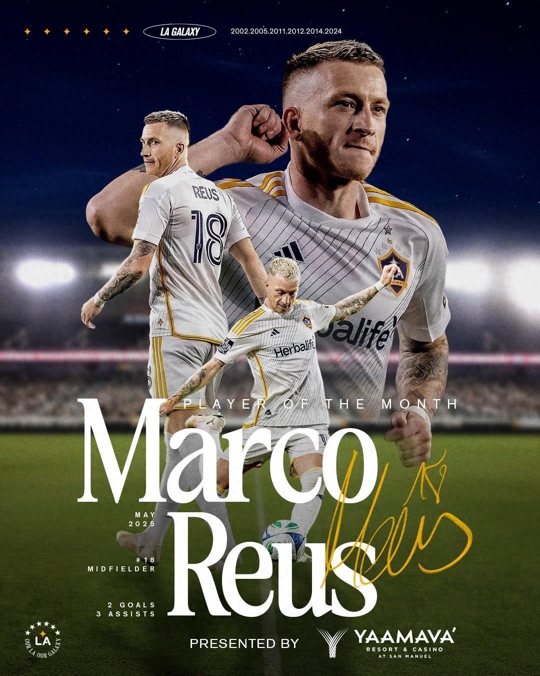 近日,美職聯球隊洛杉磯銀河官方宣佈,德國球星羅伊斯榮膺球隊5月最佳球員獎項。