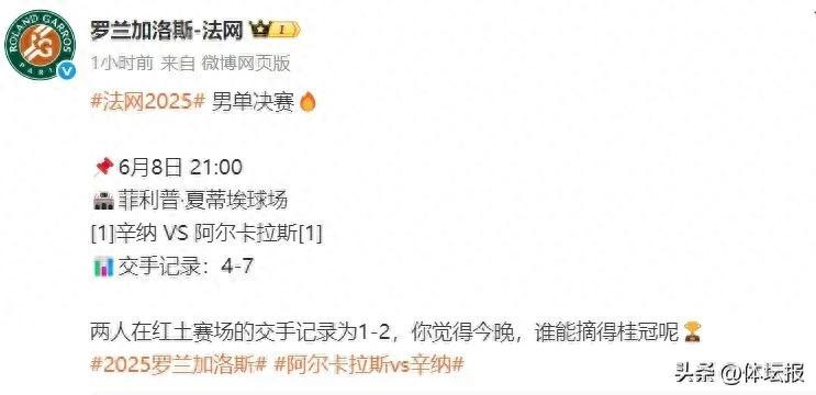 此前,兩人的交手記錄阿爾卡拉斯以7-4佔據先機。紅土賽場也是阿卡2-1獲勝較多。