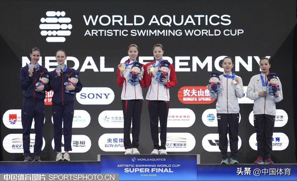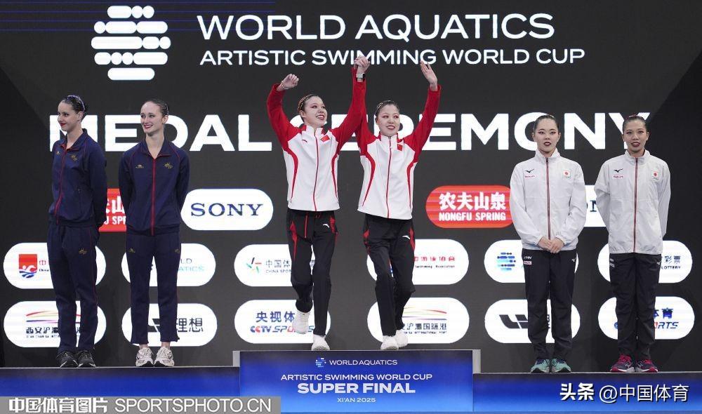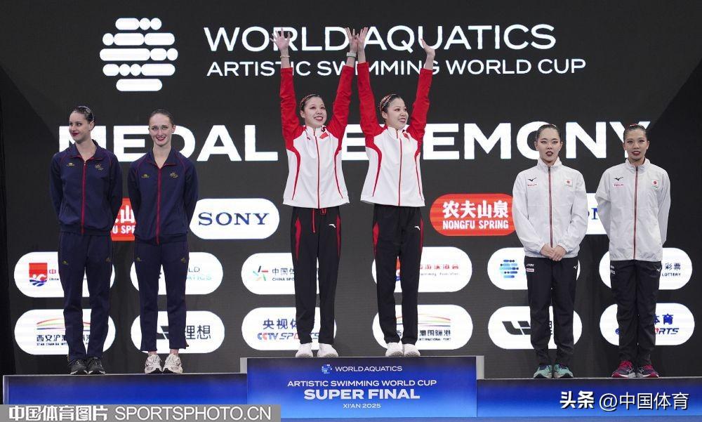 中國體育訊 6月14日,2025年世界泳聯花樣游泳世界盃總決賽在西安奧體中心遊泳跳水館展開第二個比賽日的爭奪。在女子雙人自由自選決賽中,中國隊雙胞胎姐妹組合林彥含/林彥君姐妹以266.1442分斬獲金牌。這是當日中國隊收穫的第二枚金牌,稍早前進行的男子單人自由自選決賽中,中國小將郭牧也加冕桂冠。(中國體育圖片 魏徵 攝)