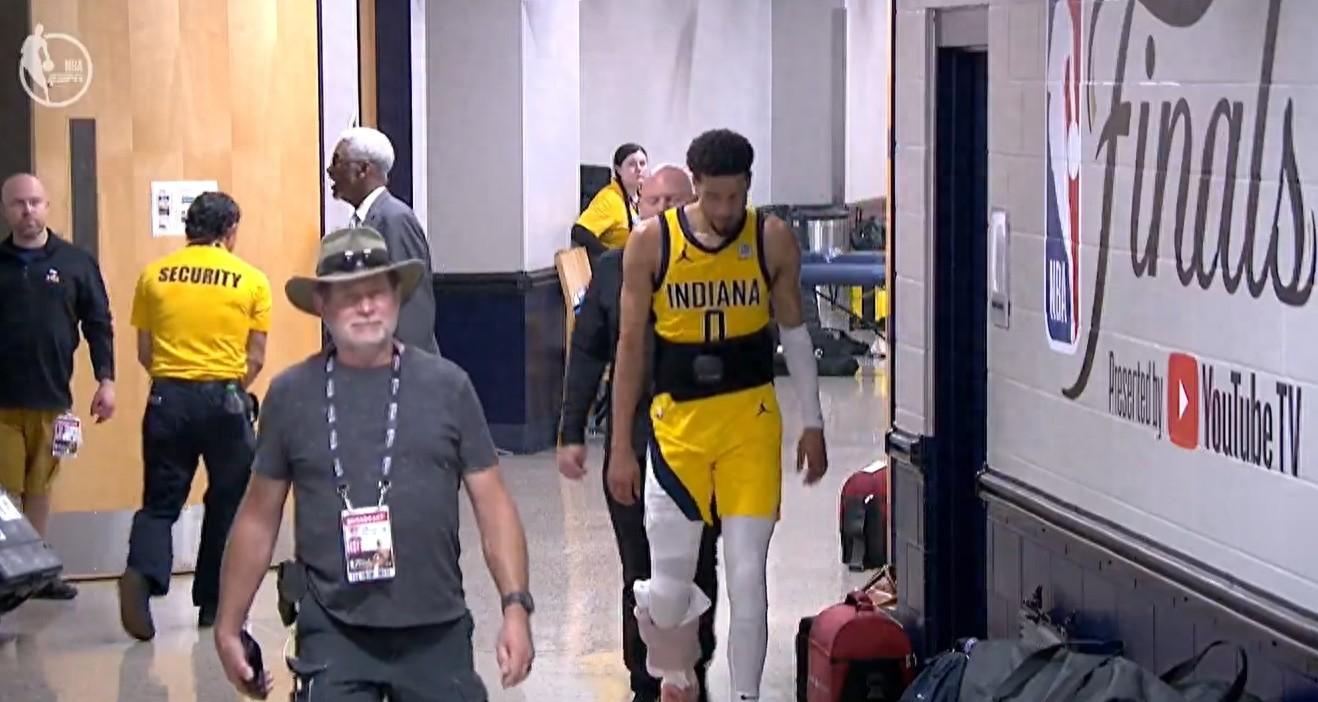 在中場休息期間,NBA名記Shams在直播間談到了半場表現不佳的哈利伯頓,Shams透露哈利伯頓遭遇右小腿緊張傷勢,他正在緊急處理。在G2時哈利伯頓就曾一瘸一拐,此前他是右腳踝扭傷。