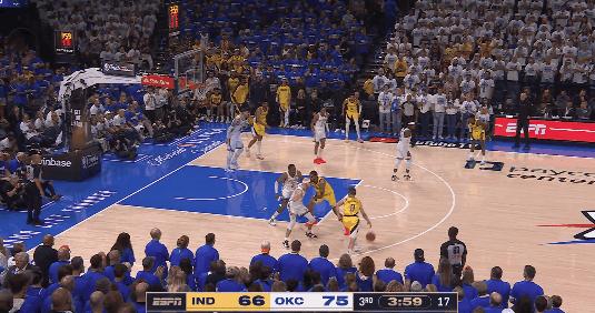 此時,步行者的兩位替補站了出來。麥康納和託平接連撕開雷霆防線,將差距一舉縮小至5分。前者單節轟下13分,讓比賽仍存在不少變數。