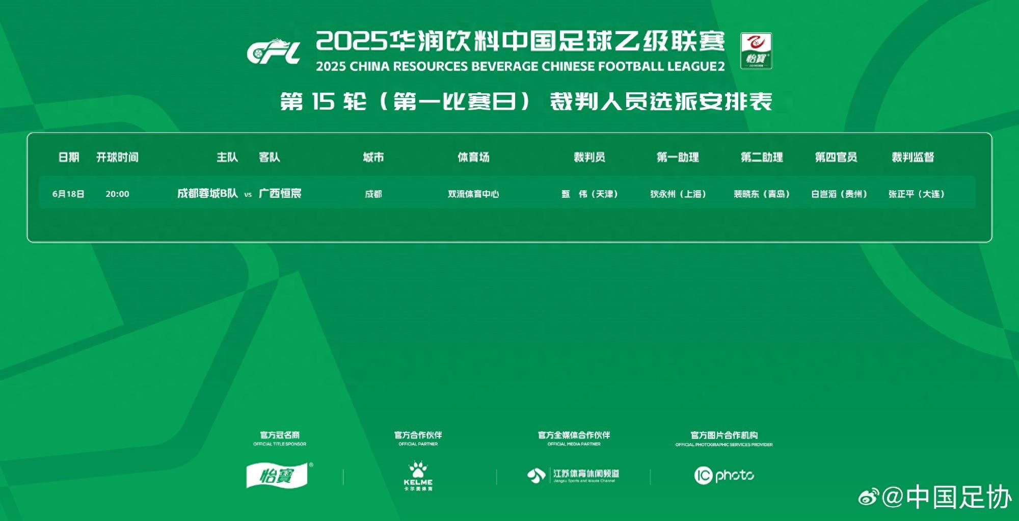 中乙第15輪第一比賽日裁判選派:甄偉執法成都B隊vs廣西恆宸