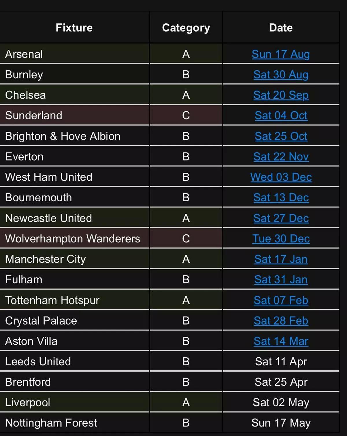 十一場聯賽被標記爲B類,價格在57英鎊至86英鎊之間;兩場爲C類(37-60英鎊);而國內盃賽則爲D類(32-52英鎊)。青少年和老年優惠票價仍然保留,此分級制度僅適用於單場票會員,不適用於季票持有者。