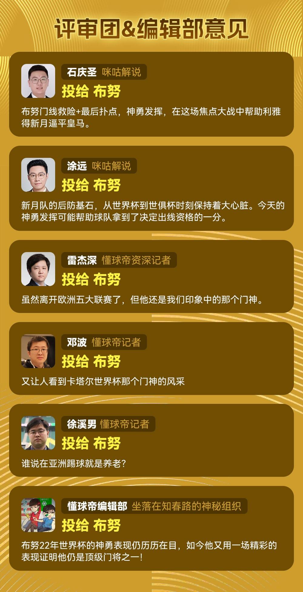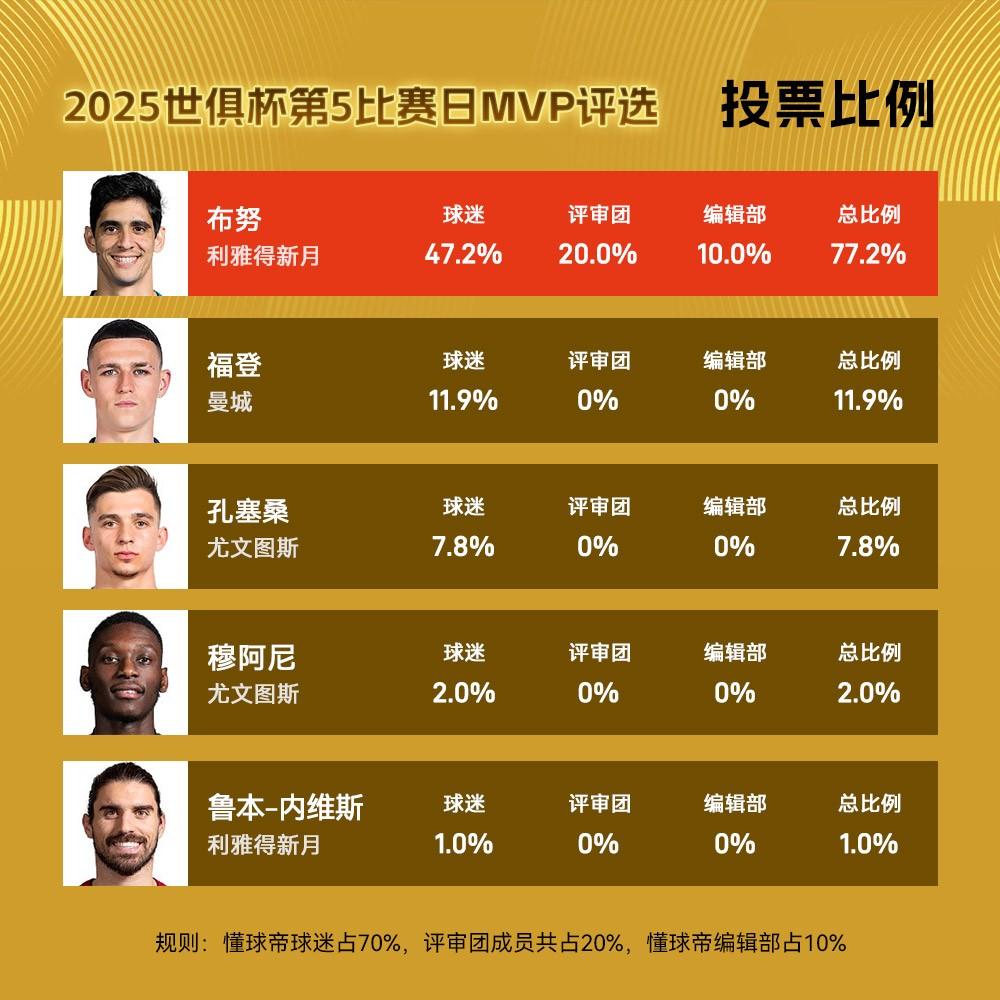 球迷朋友們大家好,歡迎來到懂球帝X咪咕2025世俱杯每日MVP評選。2025世俱杯第5個比賽日MVP得主出爐,我們迎來了本屆世俱杯首位包攬評審團&編輯部全部選票的球員,利雅得新月門將布努!