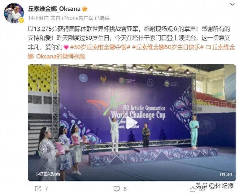 這次比賽丘索維金娜以13.275分獲得亞軍,對她而言這是最好的生日禮物。賽後她難掩激動,通過社媒寫道:“以13.275分獲得國際體聯世界盃挑戰賽亞軍,感謝現場觀衆的掌聲。感謝所有的支持和愛,昨天剛剛度過50歲生日,今天在塔什干家門口登上領獎臺,這一切意義非凡,愛你們。”