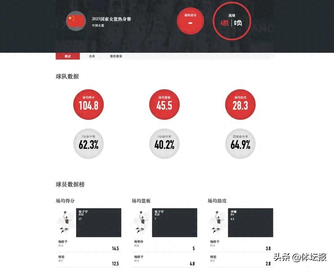 數據方面,本場比賽中國女籃三人得分上雙。王思雨17分1籃板3助攻3搶斷1蓋帽;張子宇16分4籃板;翟若雲11分1助攻2搶斷1蓋帽。
