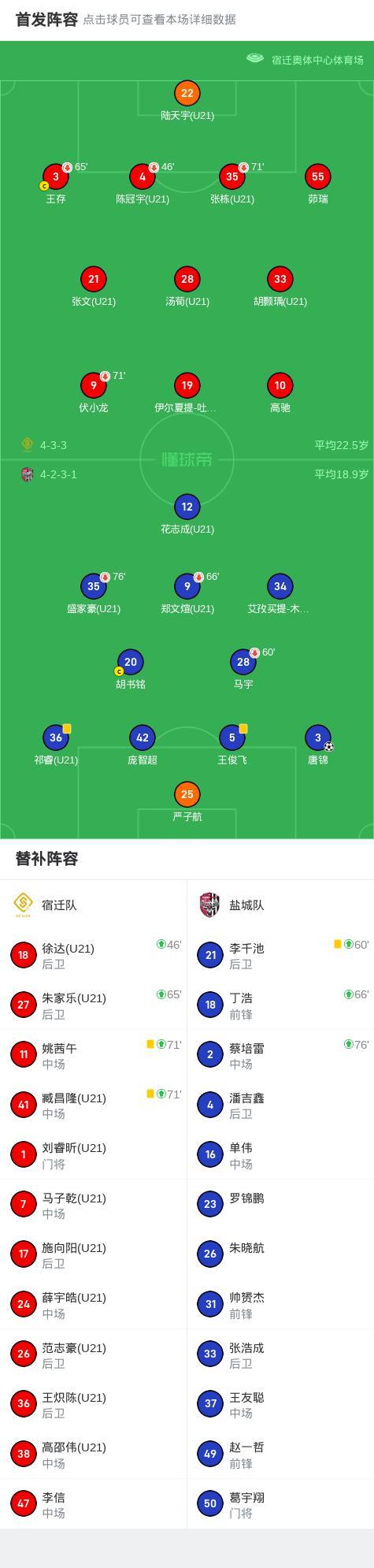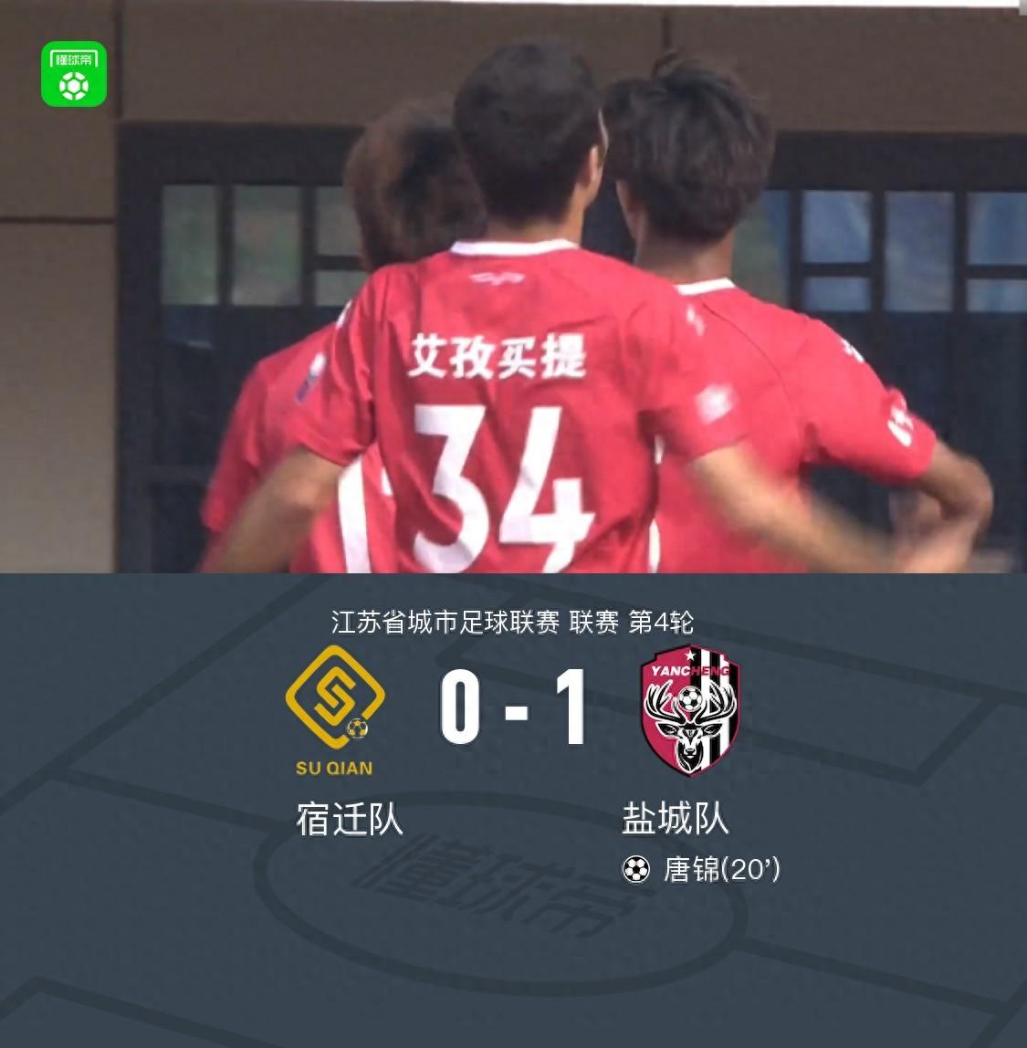 北京時間6月21日,江蘇省城市足球聯賽第4輪,宿遷隊主場迎戰鹽城隊。比賽中,鹽城隊由唐錦打入全場唯一進球。最終,鹽城隊客場1-0戰勝宿遷隊迎三連勝,登頂蘇超榜首。
