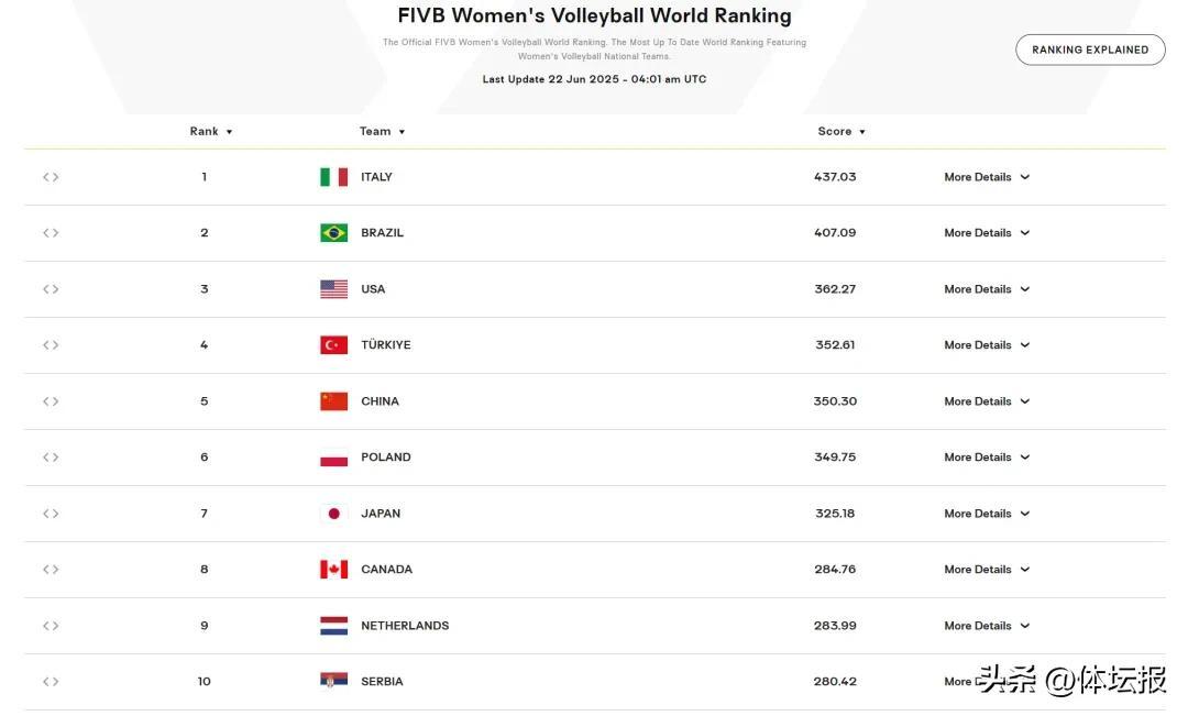 6月21日晚進行的2025世界女排聯賽香港站比賽中,中國隊以3:1戰勝日本隊,取得三連勝。以3比1擊敗日本女排之後,中國女排拿到7.96分世界排名積分,以351.47的總分反超日本隊,實時世界排名世界第五位,重新奪回亞洲第一。