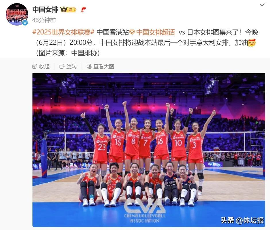 今天(6月22日)是2025世界女排聯賽香港站比賽的最後一個比賽日。預計今晚20:00,中國隊將對陣世界排名第一的意大利隊。