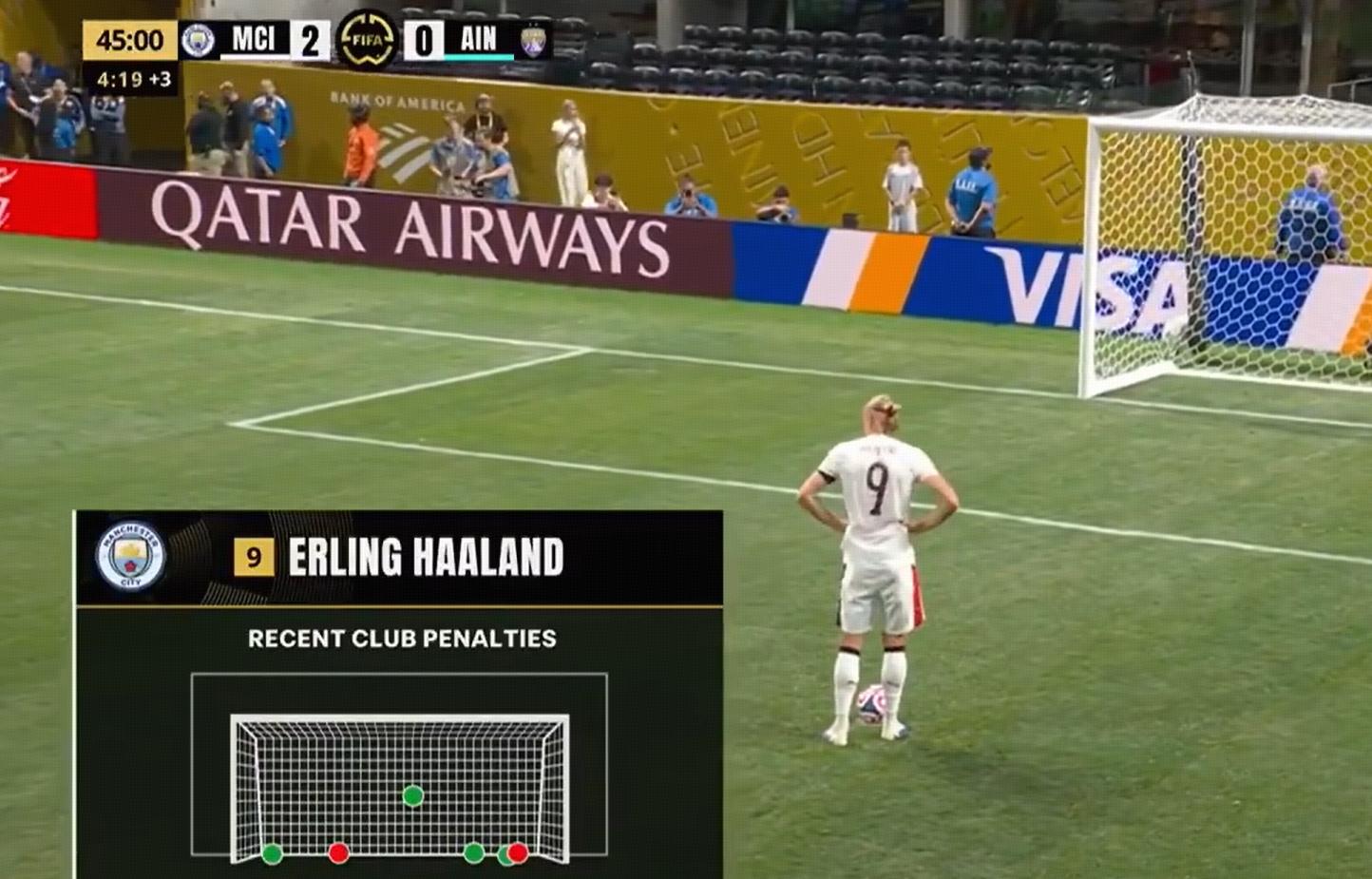 在上半場即將結束的之後,又一個男人站出來了,他就是哈蘭德,隊友阿坎吉造點,主裁判在經過VAR回看之後,果斷判罰了點球,哈蘭德站在12碼前,低射球門右側,艾因隊門將直接判斷錯了,這球有了,挪威鋒霸哈蘭德也收穫了個人世俱杯的首粒進球!事實上除了點球,哈蘭德還有一次單刀破門機會,他在前場搶斷後衛後晃過門將挑射,可惜球滑門而過。