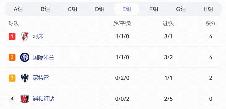 河牀與國米目前都是4分入賬,取得1勝1平的戰績,但河牀的淨勝球要多一些,暫時位居榜首,“藍黑軍團”排名第二,蒙特雷兩連平之後,2分入賬,依然有出線機會,而墊底的浦和紅鑽,連輸兩場比賽之後,0分出局,門將西川周作賽後也是遺憾落淚,最後一場只能是榮譽之戰了。