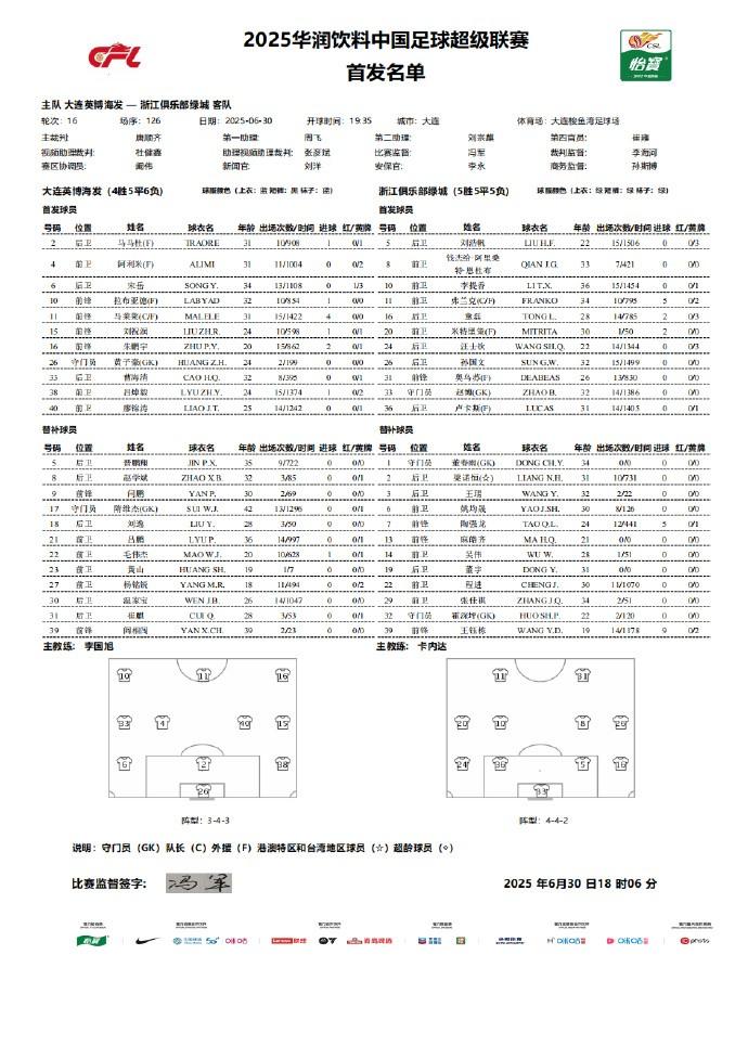 北京時間6月30日19:35,中超第16輪的一場較量。大連英博坐鎮主場,迎戰浙江。賽前,雙方的陣容公佈如下: