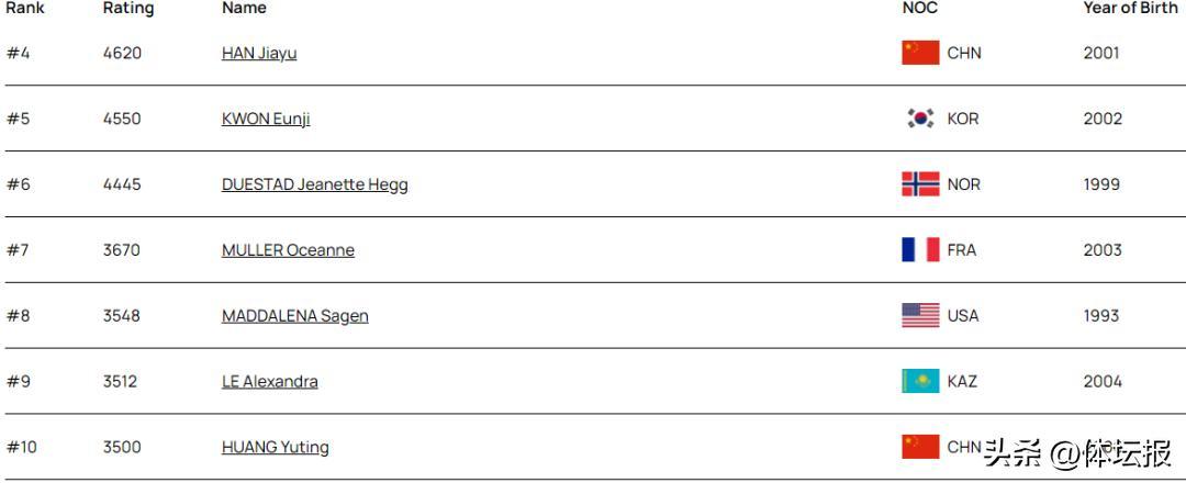 此外,前10排名中,浙江隊員佔三席,另兩位也是大家耳熟能詳的韓佳予(4)和黃雨婷(10)。