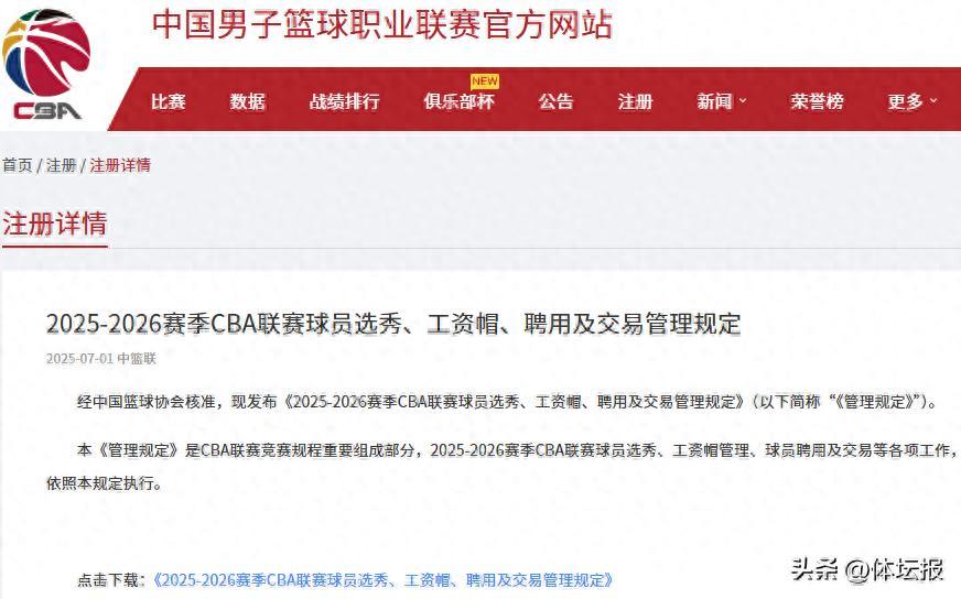7月1日,新賽季CBA聯賽自由球員轉會市場正式開啓,在首個交易日,官方發佈《2025-2026賽季CBA聯賽球員選秀、工資帽、聘用及交易管理規定》,多項新規產生,包括對外援註冊名額進行限制,對青訓球員的認證進行簡化,同時還約定本土球員與外援的薪資頂額,維持在600萬人民幣和425萬美元。(點擊本文末“閱讀原文”可至官網查看公告和下載新規)