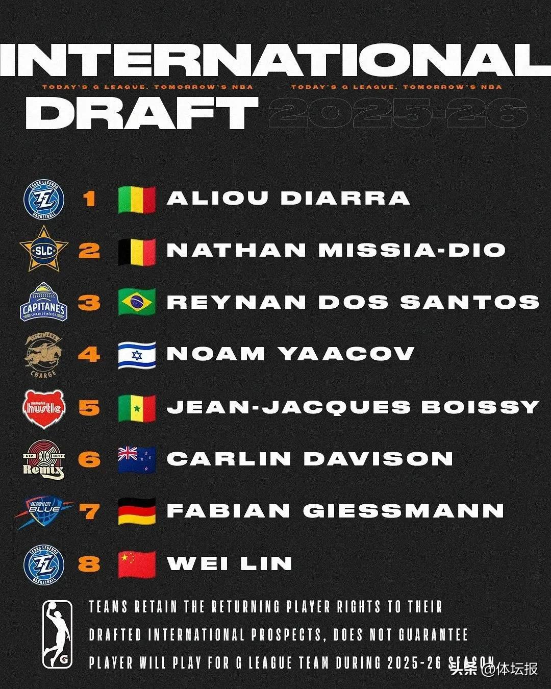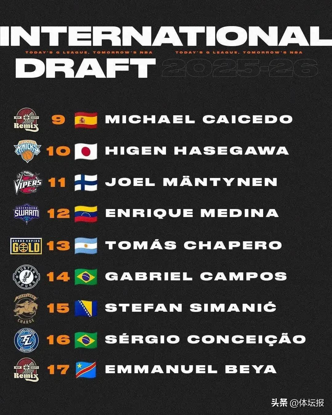 本次選秀共有來自15個國家的17名球員被選中——其中六名球員在2026年至2028年期間具有NBA的參選資格。