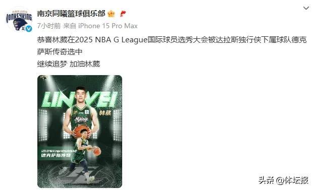 在得知林葳被選中的消息後,南京同曦籃球俱樂部發文祝賀:“恭喜林葳在2025 NBA G League國際球員選秀大會被達拉斯獨行俠下屬球隊德克薩斯傳奇選中。繼續追夢,加油林葳!”