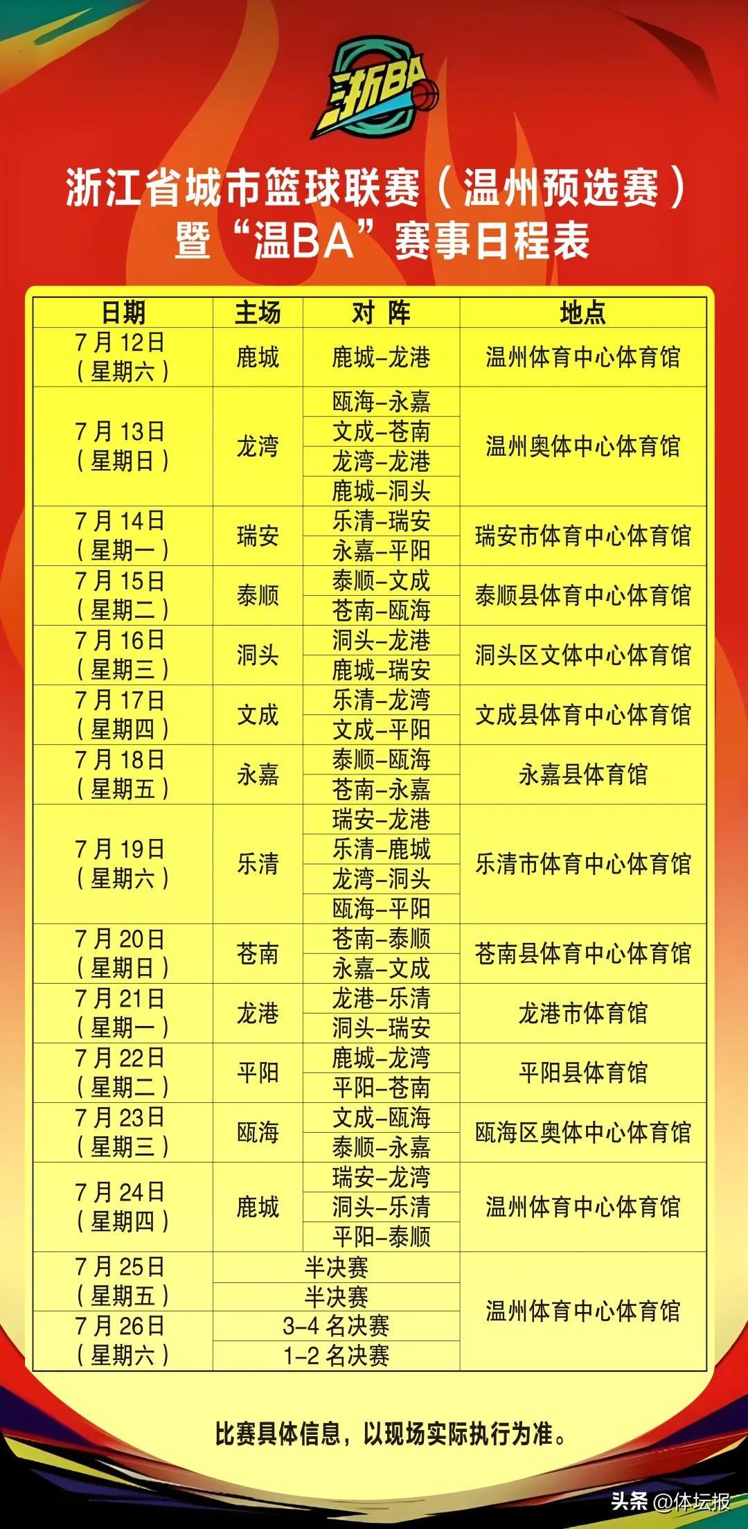 第一階段:(7月12日-23日):小組賽採用單循環主客場制,12 支溫州賽區參賽隊伍通過抽籤分爲兩組,12 個縣(市、區)將依次迎來主場賽事,比賽地點分佈在各縣(市、區)體育館。