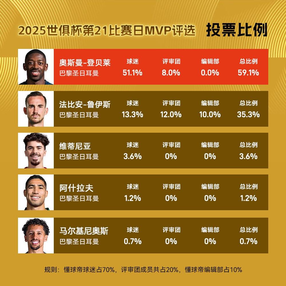 球迷朋友們大家好,歡迎來到懂球帝X咪咕2025世俱杯每日MVP評選。2025世俱杯第21個比賽日MVP得主出爐,今天的半決賽中,巴黎大勝皇馬,也讓今日的評選變成了“隊內MVP”評選,最終登貝萊憑藉開局1球1助的表現獲評今日世俱杯MVP!
