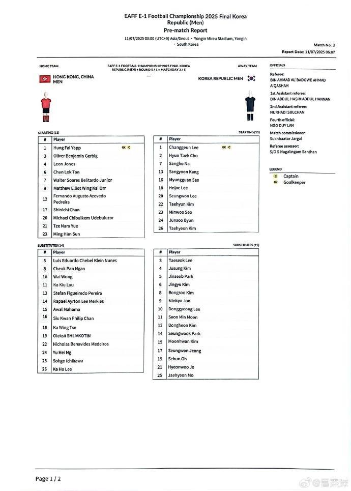 北京時間7月11日19:00,東亞杯小組賽第二輪,中國香港對陣韓國,賽前雙方公佈首發: