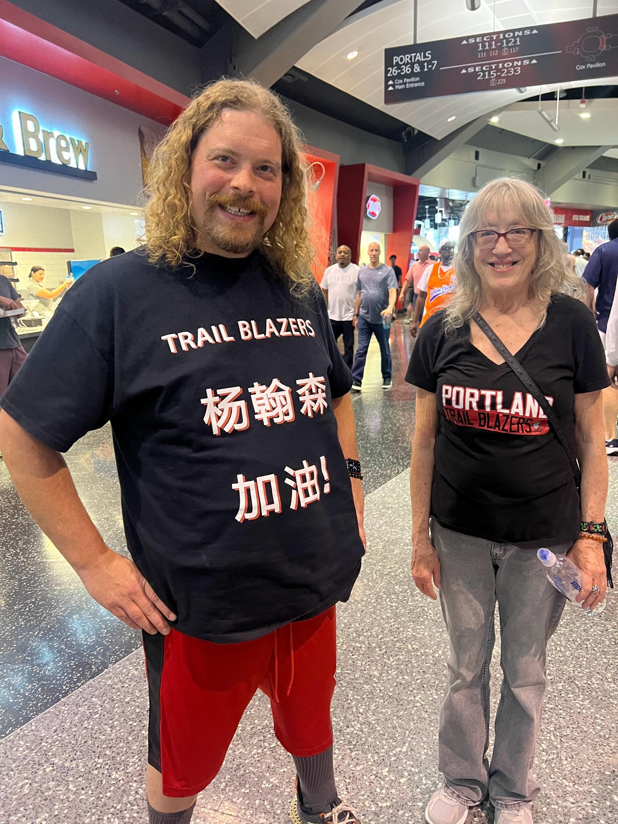 賽前,解說員殳海更新社媒,分享了一張他在前線拍攝的照片:一位開拓者球迷身着定製T恤,上面用中文印着:楊翰森,加油!值得一提的是,衣服上楊瀚森的“瀚”字被錯印成了“翰”,少了三點水的偏旁。
