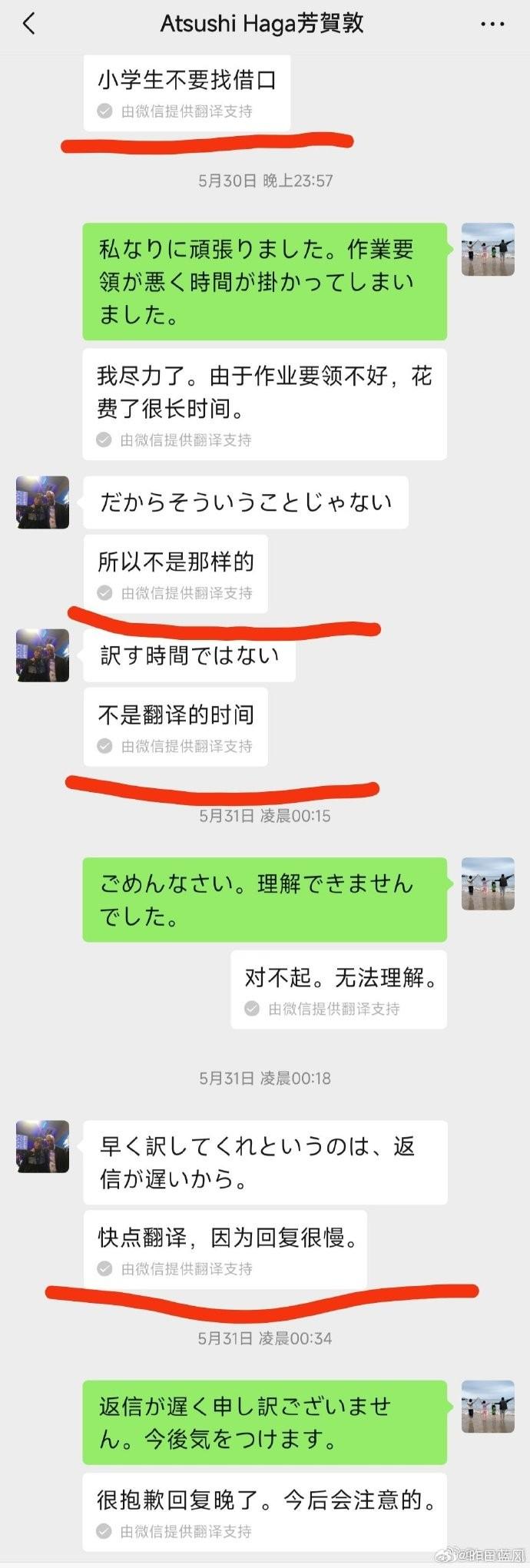 5、事發:5月30日晚23:01-凌晨00:34分因翻譯工作,芳賀敦教練開始無理指責和侮辱徐進(詳見圖),5月31日早上班時間,芳賀敦教練再次無理指責徐進與其發生肢體衝突,並從9:20-9:36指指點點謾罵徐進,次日(6月1日),徐進突發猝死離開了人世。