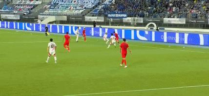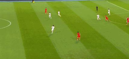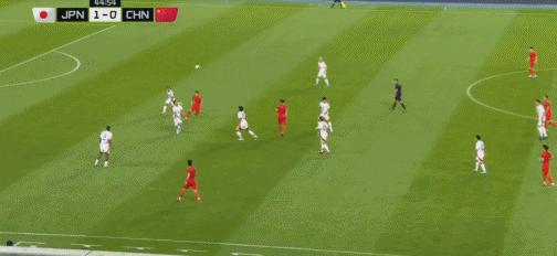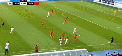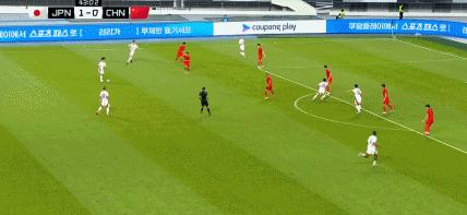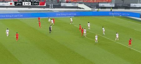 第43分鐘,國足後防被打穿,佐藤龍之介打門被顏駿凌化解
