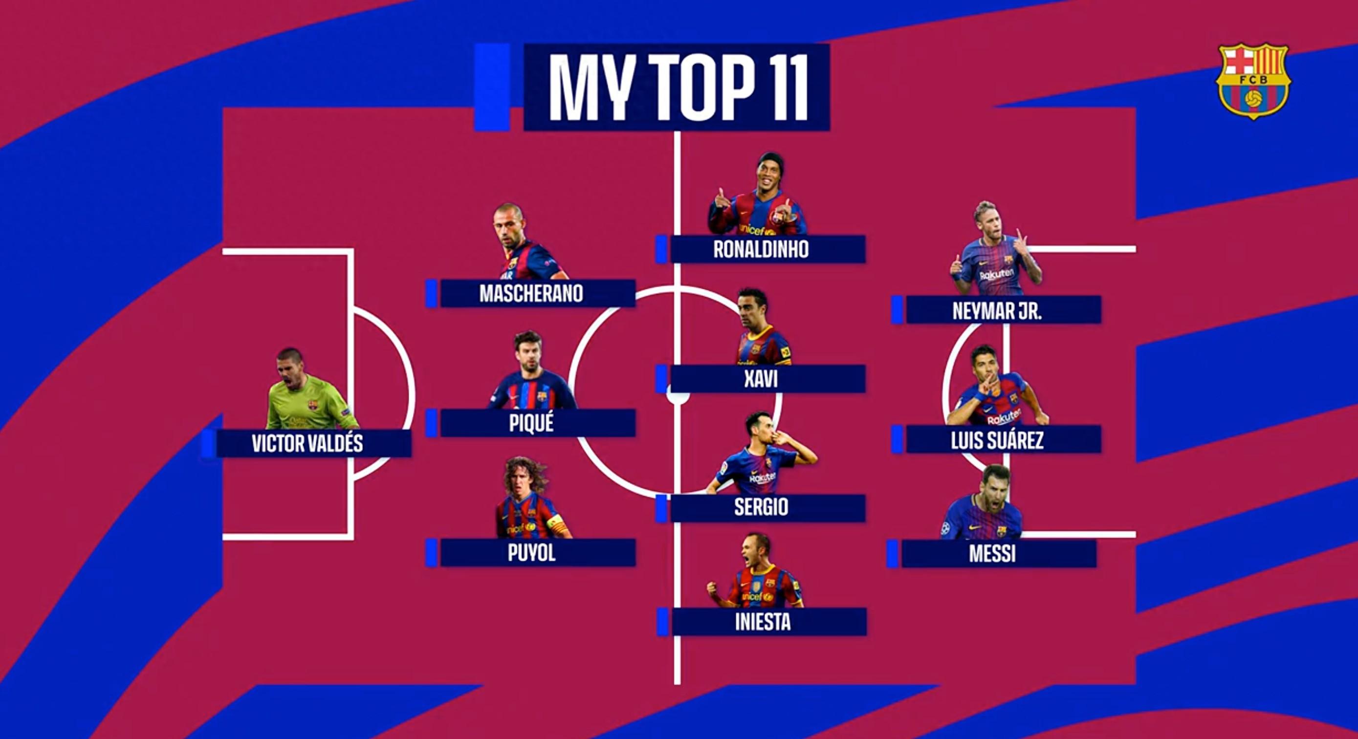 門將位置上亞馬爾選擇了巴爾德斯,後防線他的選擇是普約爾、皮克、馬斯切拉諾,中場四人分別是伊涅斯塔、布斯克茨、哈維以及羅納爾迪尼奧,梅西、蘇亞雷斯以及內馬爾組成鋒線。