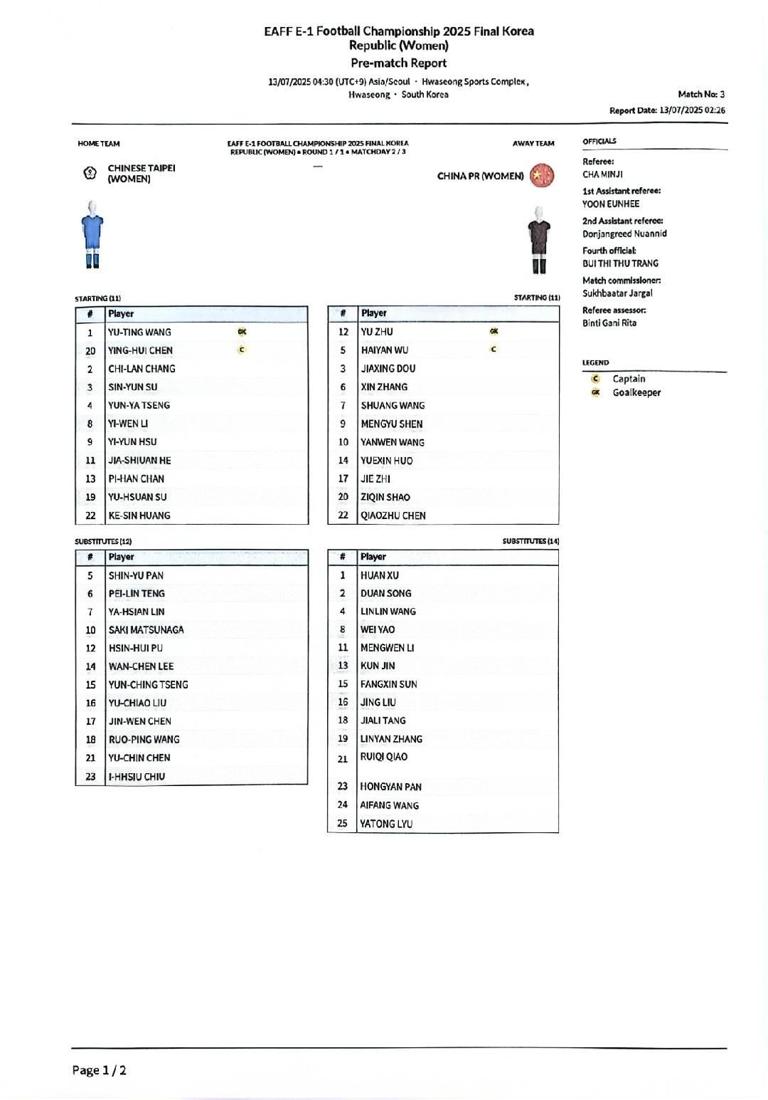 北京時間7月13日15:30,女足東亞杯小組賽第2輪,中國女足對陣中國臺北女足。賽前首發公佈。